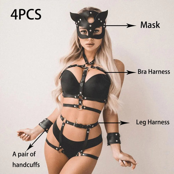 Introducing our Full Body Fetish Harness Bra - a sexy leather lingerie piece and garter stocking belt designed to accentuate your curves and add edge to your wardrobe. Crafted from high-quality synthetic leather with adjustable straps.